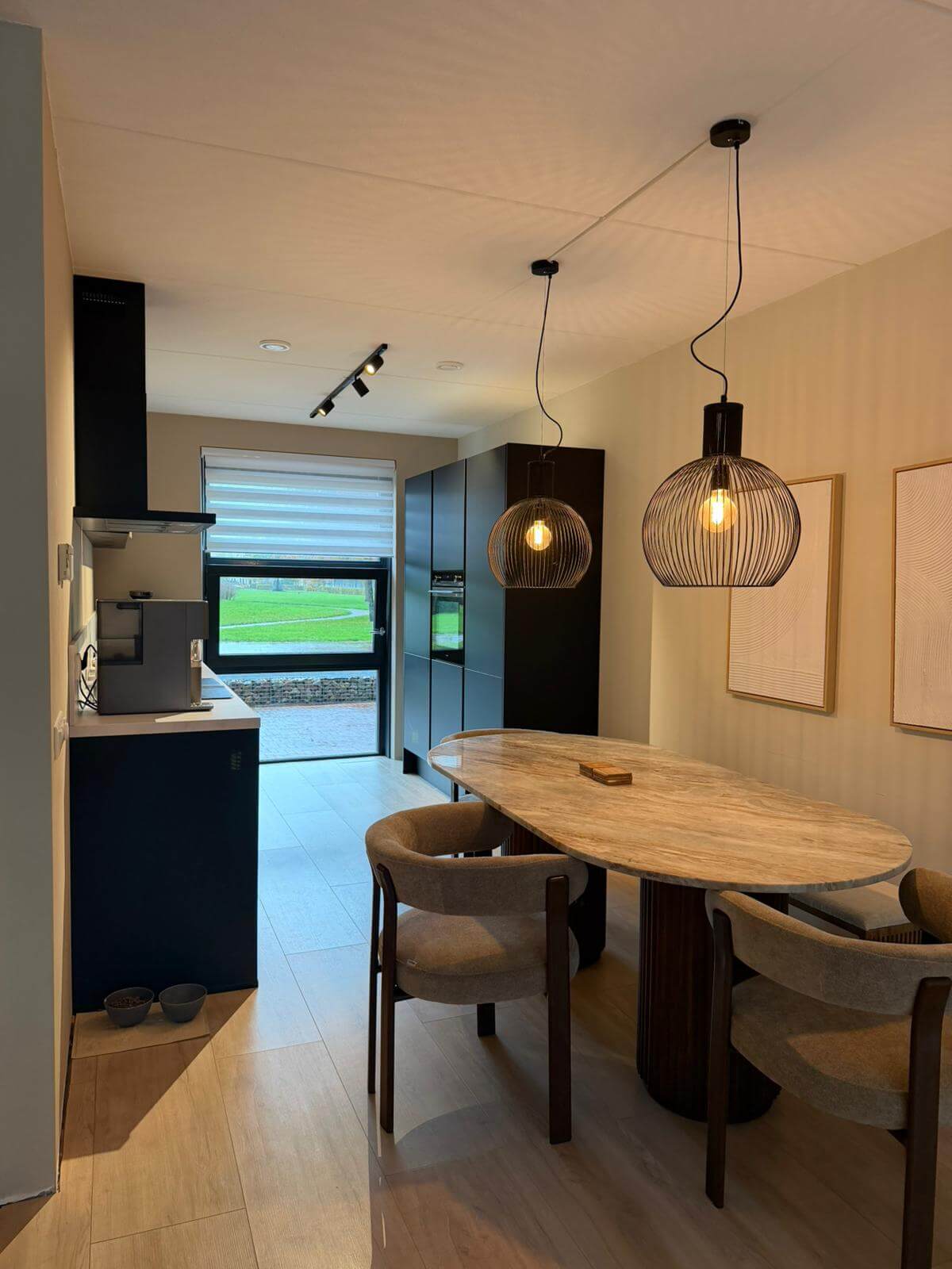 The kitchen track system continues the clean black finish used throughout the home. With precise beam angles and balanced output, the lighting supports daily use while maintaining the interior’s calm, minimalist tone. Above the dining table, decorative pendants add warmth, while the spotlights handle ambient and accent roles without distraction.